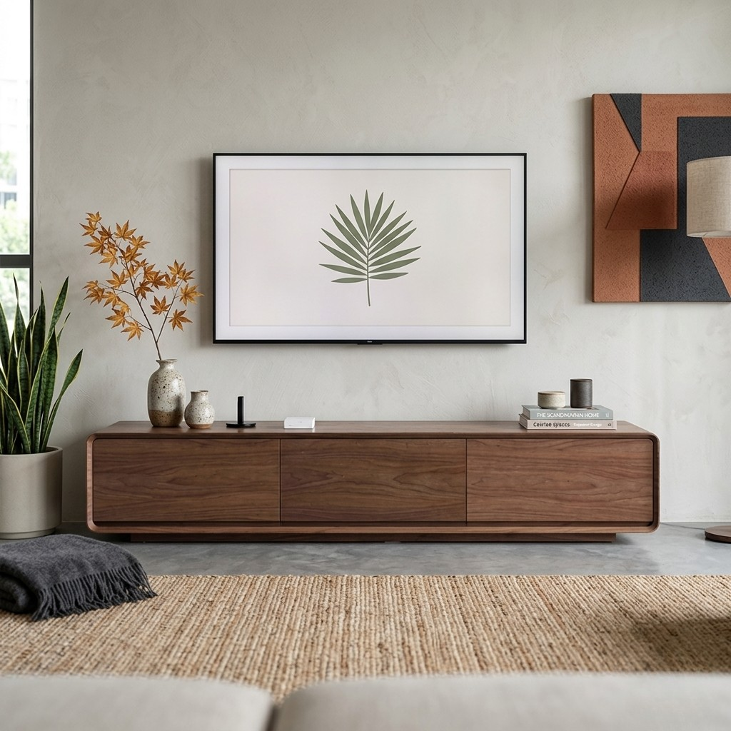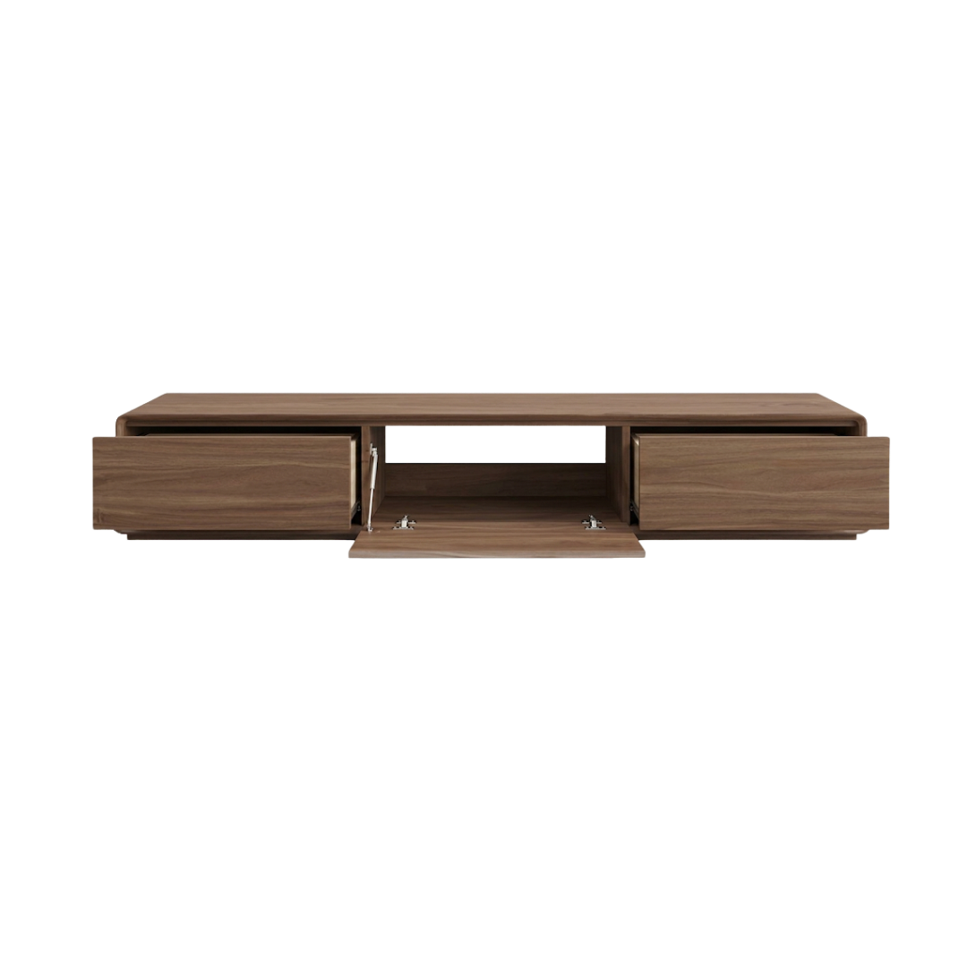 Crafted with a rich walnut veneer, this walnut tv console showcases organic wood grains that bring warmth and texture to your interior. Its silhouette is defined by sleek, rounded edges, offering a soft yet bold look that blends seamlessly into minimalist or modern homes.