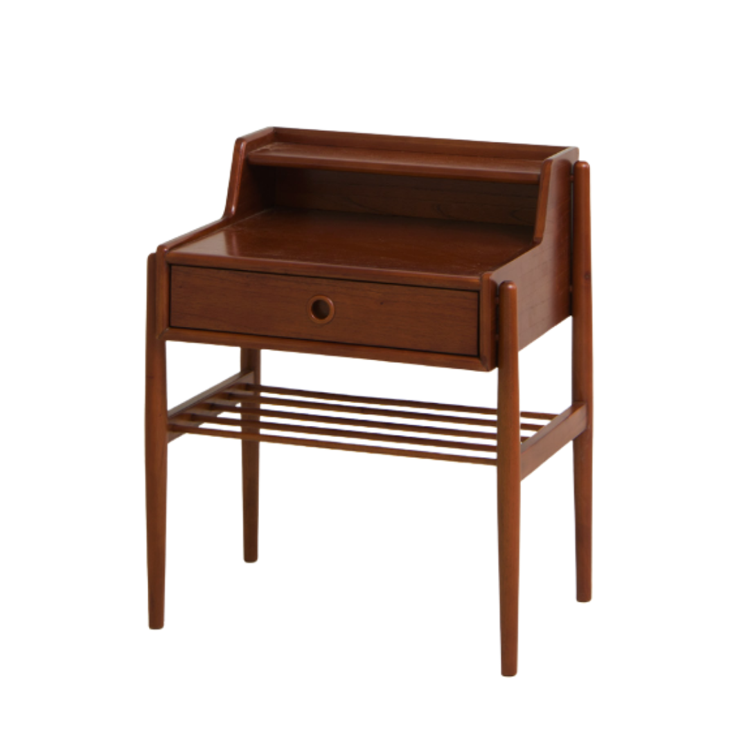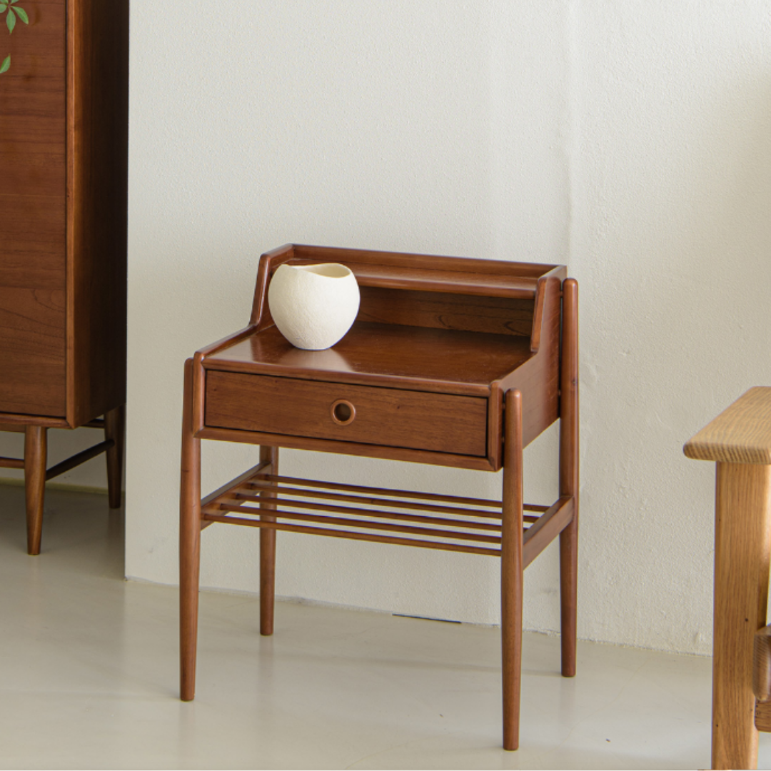 The DEN FIKA Side Table brings quiet elegance and smart organization to any room. Made from richly textured natural wood, this end table feature compact features with a drawer with additional small shelf on top.