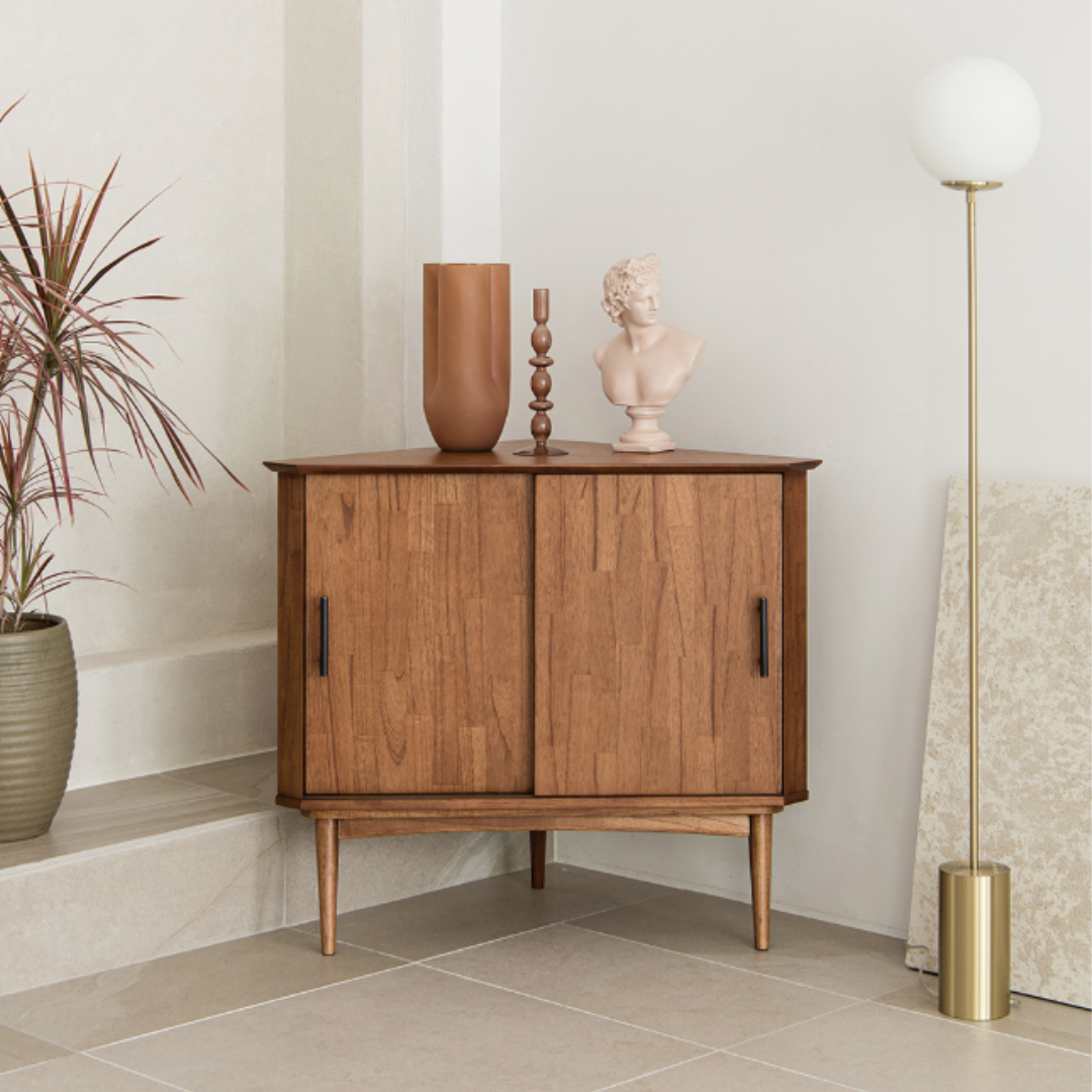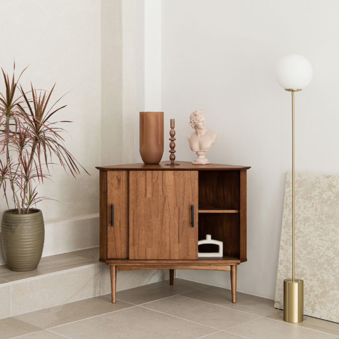 The Fika Corner Cabinet is a stylish and functional piece that seamlessly blends natural materials with minimalist design. Its natural brown finish exudes warmth, making it a versatile addition to various interior styles.