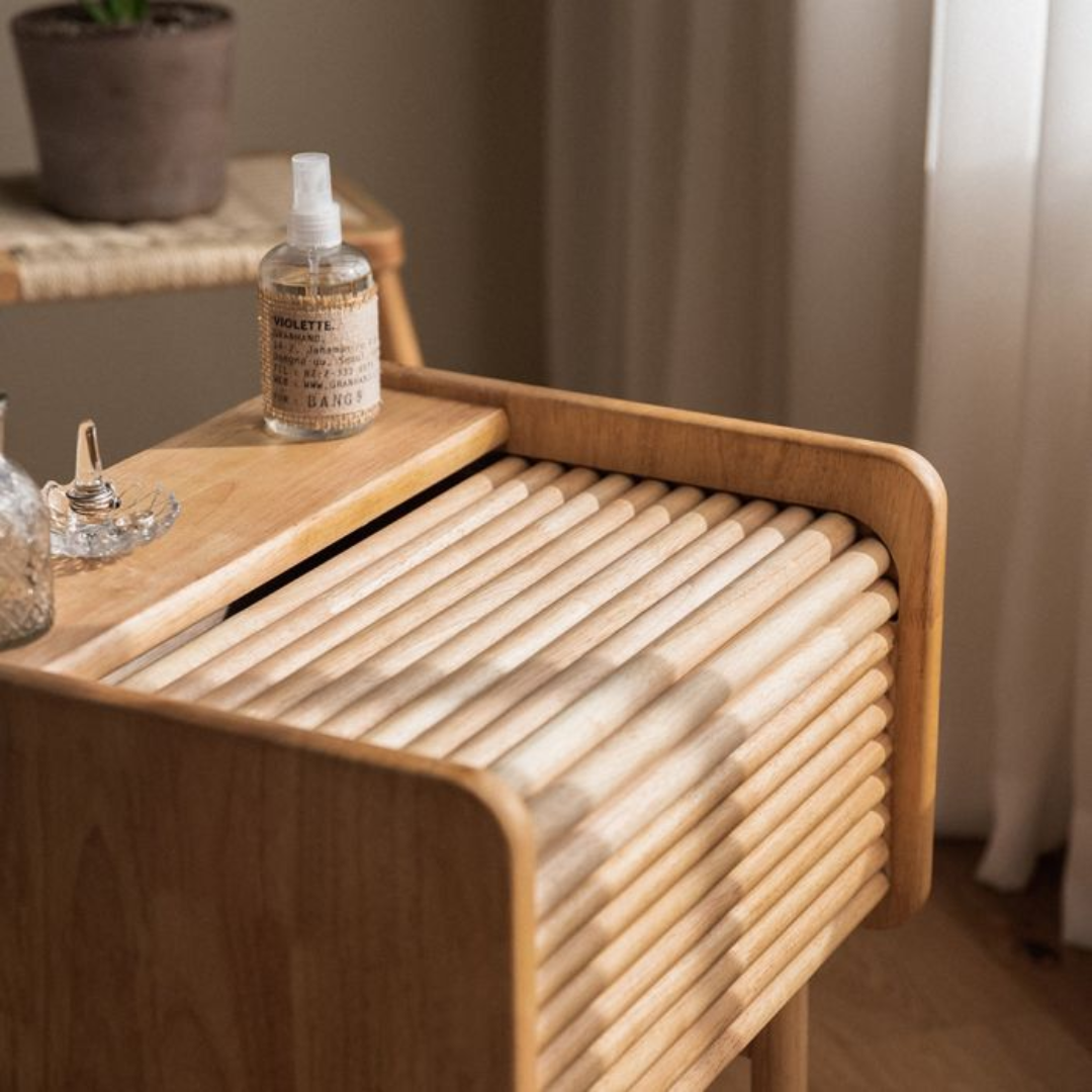 Signature tamboured design combined with cylindrical legs suitable for the display of plants, ornaments, magazines and more. Kid-friendly and multifunctional with tons of drawer space, this side table is the perfect companion in the bedroom, hallway, or living room.