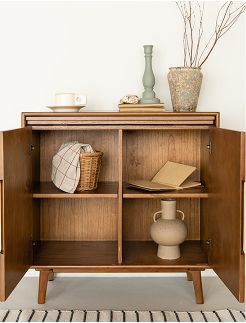 Combining visual warmth with intelligent storage, it features multiple drawers and open compartments, offering both style and substance for modern interiors.